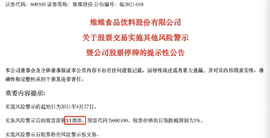 4月25日晚间,维维股份公告,公司股票将于4月27日起被实施其他风险警示,实施风险警示后的股票简称变为“ST维维”,股票价格的日涨跌幅限制为5%。