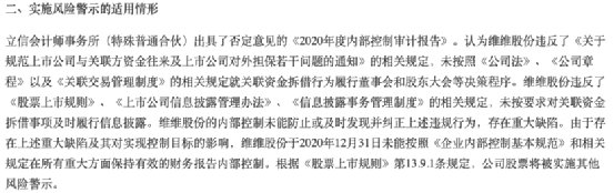 公告显示,立信会计师事务所对公司出具了否定意见的《2020年度内部控制审计报告》,认为维维股份未按照相关规定就关联资金拆借行为履行董事会和股东大会等决策程序,同时未及时履行信息披露。根据《股票上市规则》第13.9.1条规定,公司股票将被实施其他风险警示。立信会计师事务所表示,维维股份的内部控制未能防止或及时发现并纠正上述违规行为,存在重大缺陷。立信会计师事务所提到的违规事项与维维股份的原控股股东维维集团有关。