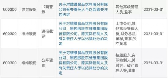 此前,3月31日晚间,上交所对维维股份及其相关董事、监事、高管人员连发三份函件,就其前期的违规行为予以公开谴责、通报批评和并予以监管关注。