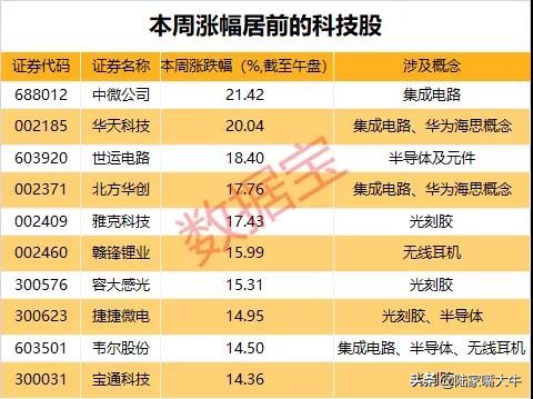 以今日午盘收盘价来算,光刻胶、集成电路、无线耳机、智能音箱、半导体及华为海思概念为主的213只科技股本周整体跑赢大盘,本周涨幅居前的科技股有中微公司、华天科技、世运电路、北方华创、雅克科技等,涨幅均超过15%。