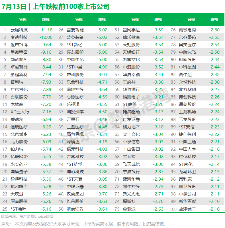 7月13日 | 上午跌幅前100家上市公司云涌科技、麦迪科技、退市银鸽、星徽精