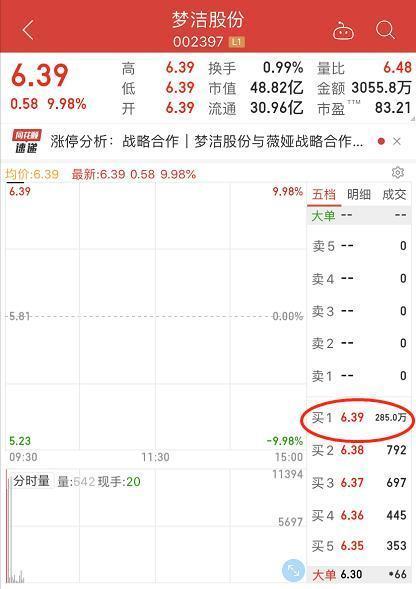 得知与薇娅合作后,梦洁股份连续来了五个一字马跳空高开式涨停!没错是5个涨停,懂点股票的都知道一字马涨停意味着什么!那就是特大利好,最早之前还有一个长阳涨停,那个代表的是开闸给散户留机会进入,前前后后现在已经6个涨停板,并且每个涨停都有大订单封单,表示出了游资强大的信心与坚定,全程不开板表示视死如归的决心(逼空),游资这种一反常态的坚定,原因很简单就是因为:薇娅。