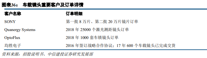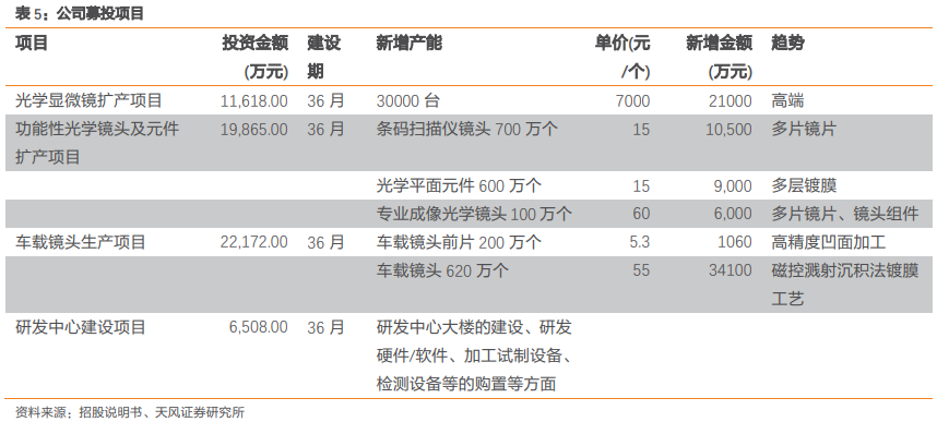 3)车载镜头:公司将通过募集资金扩产 820 万个车载镜头(其中车载镜头前片 200万个、车载镜头 620 万个),投资总额达 2.2 亿元,募投金额为 1.8 亿元。上述募投项目预计产品售价分别为镜头 55 元/个及镜片 5.3 元/个。本项目实施达产后,年新增销售收入35,160万元,年新增利润总额7,319万元,年新增净利润6,221万元。