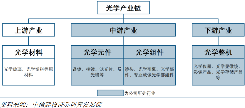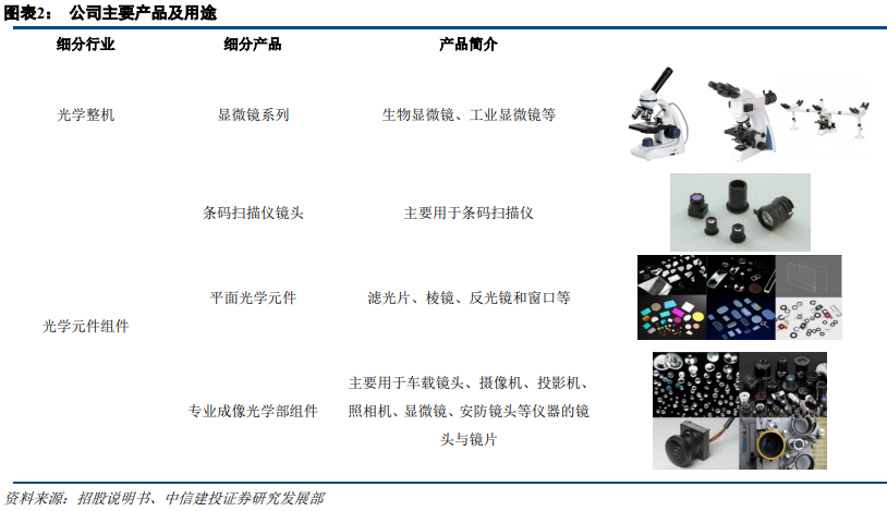 从主营构成来看,公司44.45%的收入和34.75%的毛利来自于显微镜,52.59%的收入和59.25%的毛利来自于光学元件组件。显微镜处于光学产业链下游,光学元件组件为产业链中游,公司产品包括扫描仪镜头、相机镜头、车载镜头、滤光片、棱镜等。