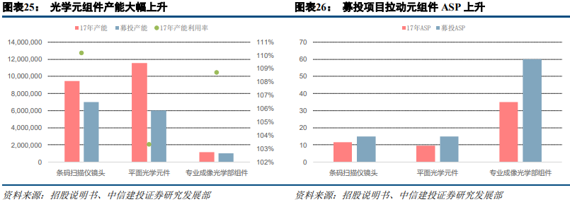 2)光学元组件:公司投入 1.99 亿元扩产光学元组件项目 3 年后达产,形成条码扫描仪镜头700 万、光学平面元件 600 万和专业成像光学镜头 100 万的产能,合计贡献年销售额 2.55 亿元;平均 ASP 分别为 15 元、15 元和 60 元,相比于 17 年平均 ASP 分别提升 3.52 元、5.36 元和 24.89 元。过去 2 年公司条码扫描镜头、光学平面元件和专业成像光学镜头的产能利用率均较为紧张,都在 100%以上。公司扩产后不仅打开了产能瓶颈而且提升了产品的 ASP;项目实施达产后,年新增销售收入25,500万元,年新增利润总额8,089万元,年新增净利润6,876万元。