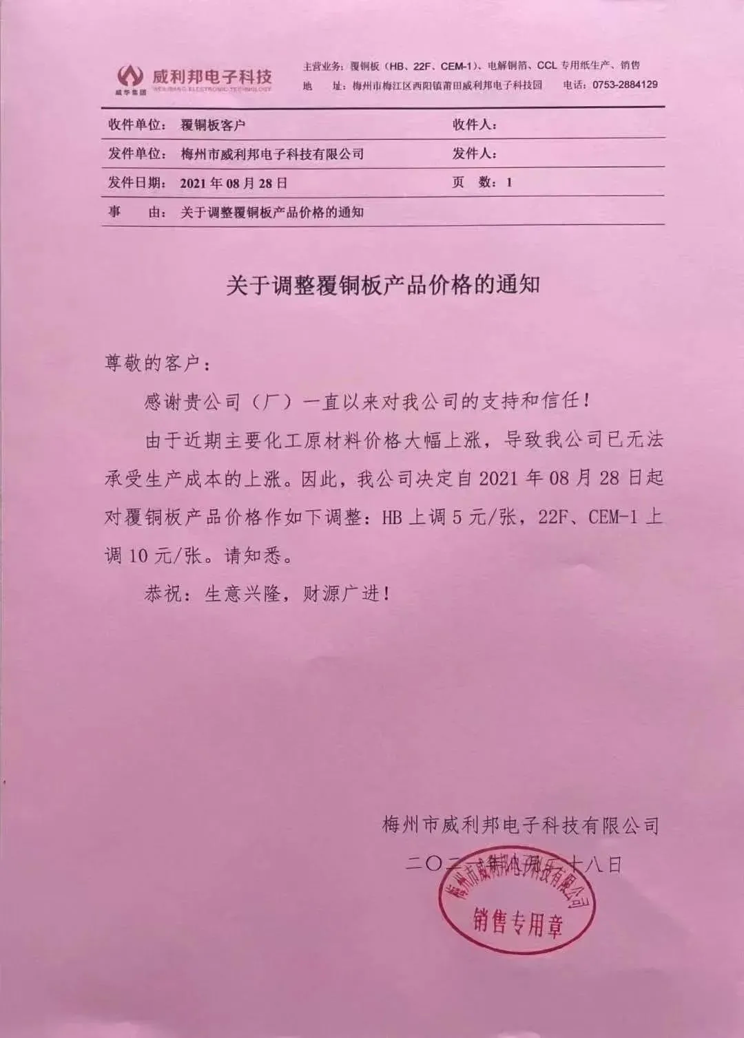 8月28日,威利邦发布《关于调整覆铜板产品价格的通知》,通知表示,由于近期主要化工原材料价格大幅上涨,导致公司已无法承受生产成本的上涨,公司决定自即日起对覆铜板产品价格作如下调整:HB上调5元/张,22F、CEM-1上调10元/张。