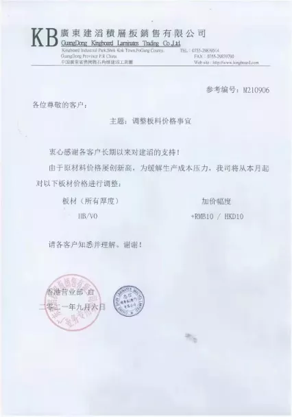 9月6日,覆铜板龙头建滔积层板发布了调涨板料价格事宜通知。建滔积层板表示,由于原材料价格屡创新高,为缓解生产成本压力,公司从本月起对板材(所有厚度)HB/VO+,加价RMB10/HKD10。
