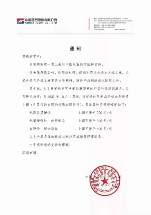 为了更好地向客户提供高质量的产品和优质的服务,公司决定自2021年10月1日起对玻纤纱及制品价格分别上调(已签订合同的仍按原合同执行),具体调整如下:热固类直接纱上调不低于200元/吨;热塑增强纱、玻纤制品上调不低于300元/吨;合股纱、短切原丝上调不低于400元/吨。