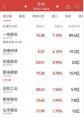 农机板块尾盘异动拉升,一拖股份尾盘直线拉升触及涨停,收盘涨7.1%。吉峰科技、联诚精密、新柴股份、弘宇股份等跟涨。