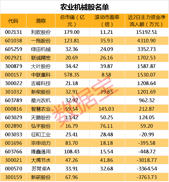 北上资金近两个交易日对4只农业机械概念股进行加仓,分别是利欧股份、中联重科、宗申动力、一拖股份。