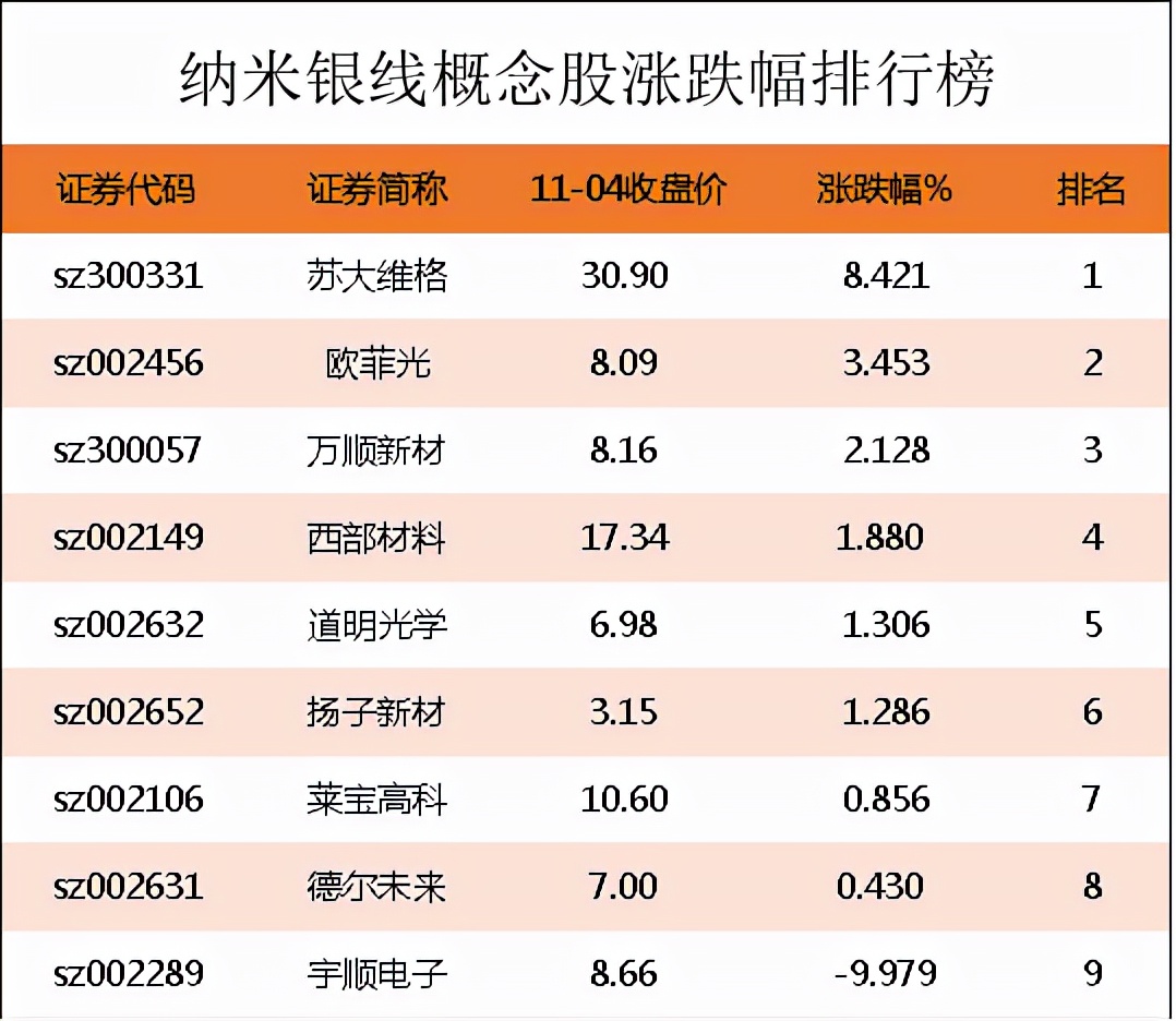 以上就是为读者们带来的纳米银线概念股涨跌幅排行榜的相关信息,本文是根据有关数据及近期事件所撰写分析文章,并不构成投资建议,据此操作,风险自担!(本文属于非商业性文章)