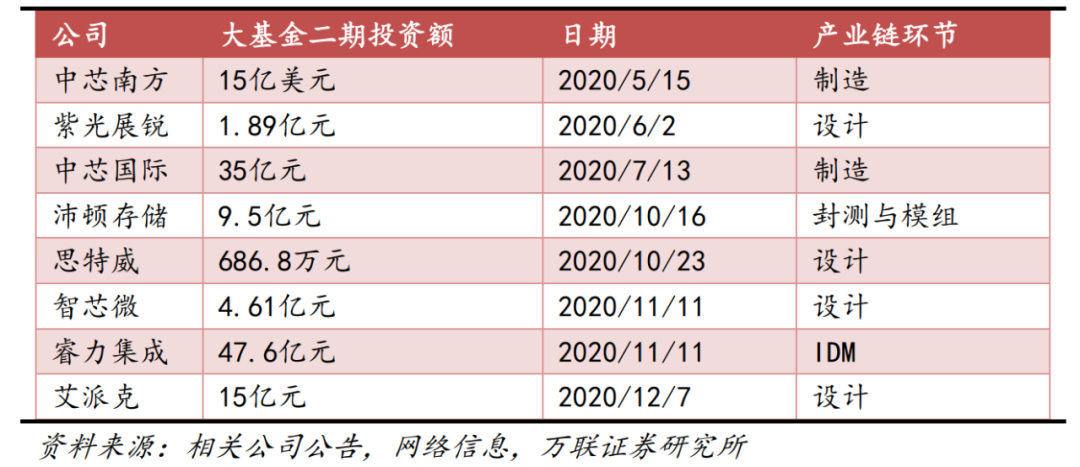 据统计,截至2020年12月中旬,已披露的大基金二期投资额超过200亿元,涉及的产业链环节包括设计、制造、封测。投资的企业包括中芯南方、紫光展锐、中芯国际等。