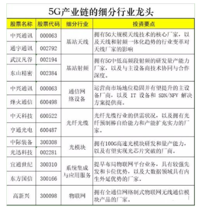 股市中5G概念股是一个笼统概念股而已,5G概念内分为很多细分行业与板块,自然每个行业和板块都会出现不同的龙头股票;5G发展框架主要分为主设备、光模板、光纤光缆、天线射频、PCB领域、网络规划;基础建设等等框架来布局5G概念股,从7大领域来分别挖掘是5G概念龙头股;