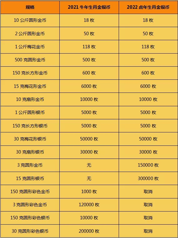 小天根据今年已经披露的发行规格,与牛年纪念币对比,做了一个表格,大家可以直观地看到它的各种变化。