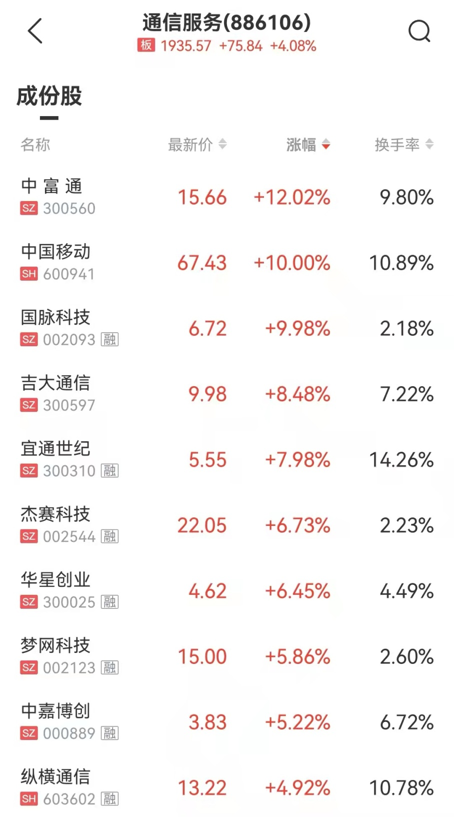 电信板块来看,通信服务指数大涨4.08%。个股中,中富通涨12.02%,中国移动、国脉科技10%涨停,吉大通信、宜通世纪、杰赛科技等跟涨。
