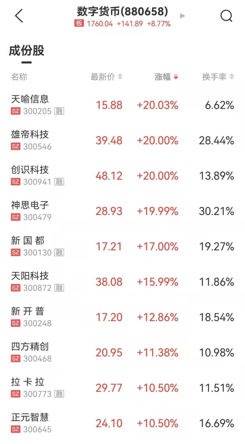 中国证券报·中证金牛座数据显示,数字货币指数大涨8.77%,个股中,天喻信息、雄帝科技、创识科技、神思电子均20CM涨停。其中,雄帝科技连续两天20CM涨停,累计涨幅约44%。