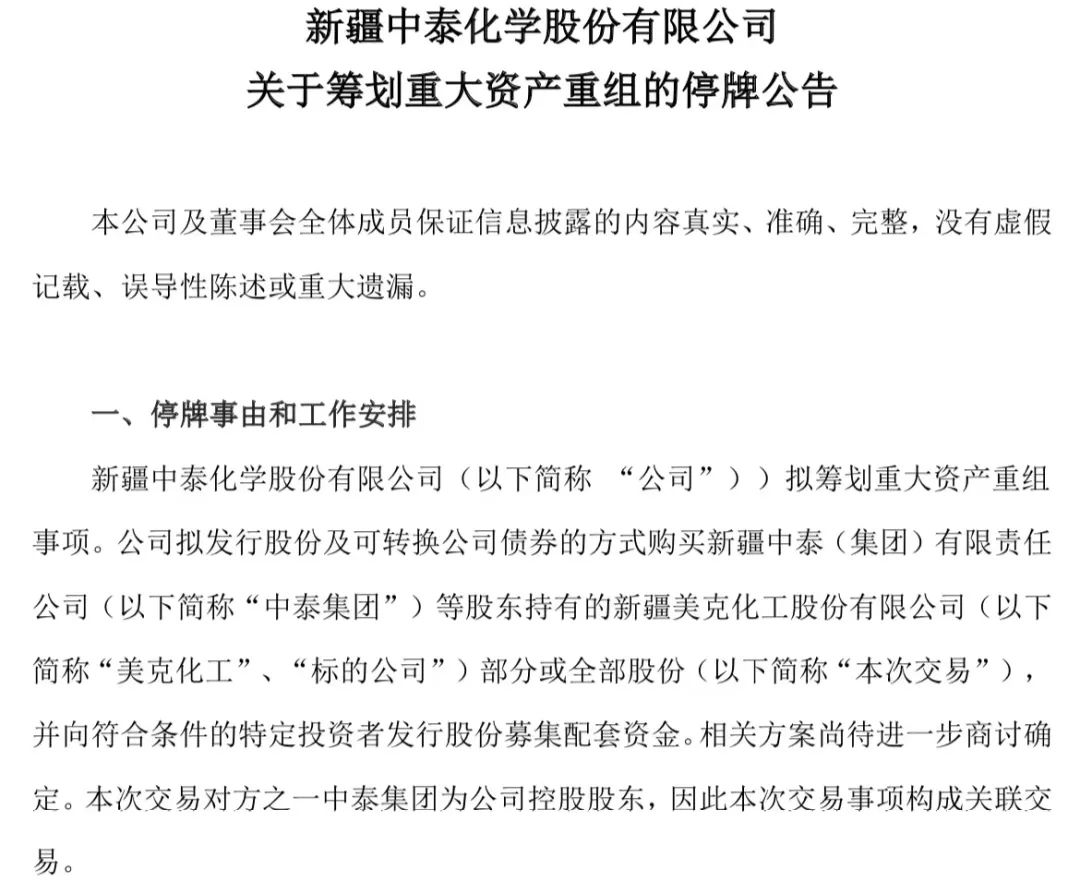 1月16日晚间,中泰化学公告,拟筹划重大资产重组事项,公司拟发行股份及可转换公司债券的方式购买新疆中泰(集团)有限责任公司(下称“中泰集团”)等股东持有的新疆美克化工股份有限公司(下称“美克化工”)部分或全部股份,并向特定投资者发行股份募集配套资金。