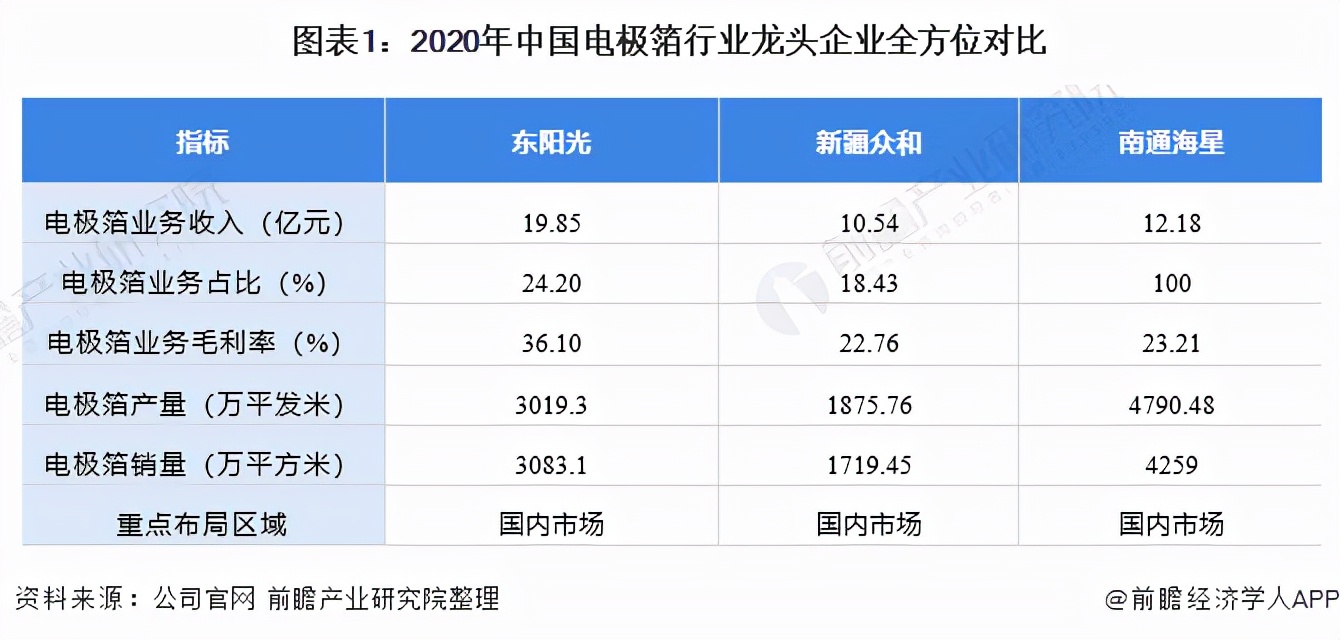目前,中国电极箔的龙头企业分别是新疆众和(600673)、新疆众和(600888)和南通海星,该三个企业在中国电极箔行业中产销量、销售收入及技术方面较为领先的企业。