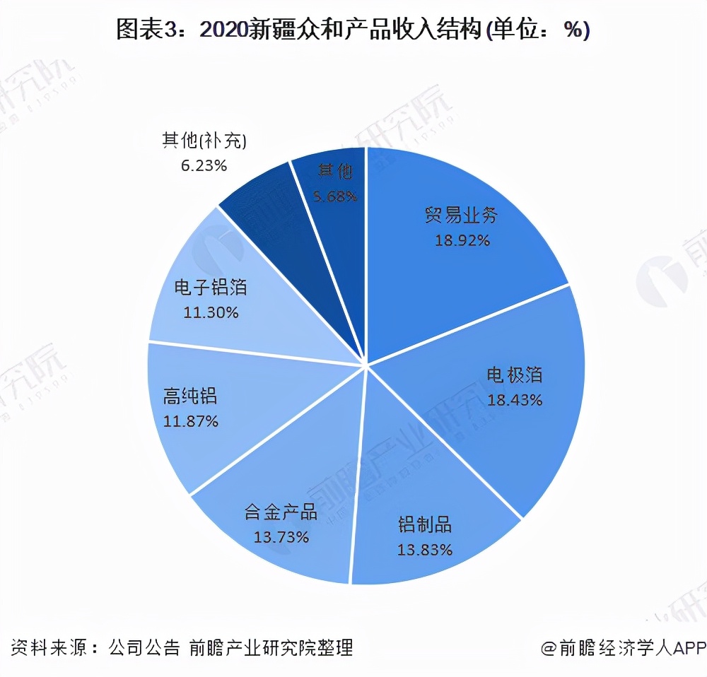 从细分的营业收入来看,2020年,新疆众和的营业收入有18.43%来自电极箔业务。其他主要营业收入分别为贸易业务、铝制品、合金产品、高纯铝、电子铝箔,营收占比分别为18.92%、13.83%、13.73%、11.87%和11.30%。电极箔及其上游业务(高纯铝和电子铝箔)业务占比超过40%。