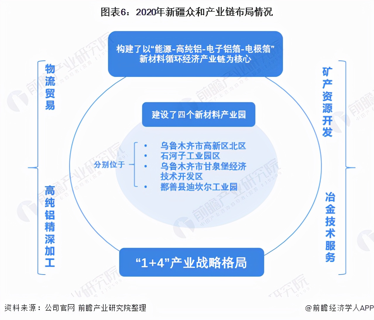新疆众和以绿色、科技、节能、环保为发展方向,在乌鲁木齐市高新区北区、乌鲁木齐市甘泉堡经济技术开发区、石河子工业园区、鄯善县迪坎尔工业园建设了四个新材料产业园,构建了以“能源-高纯铝-电子铝箔-电极箔”新材料循环经济产业链为核心,集物流贸易、冶金技术服务、矿产资源开发、高纯铝精深加工产品技术及服务共同发展的“1+4”产业战略格局。