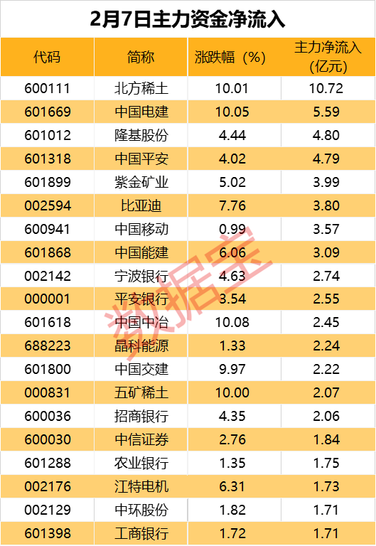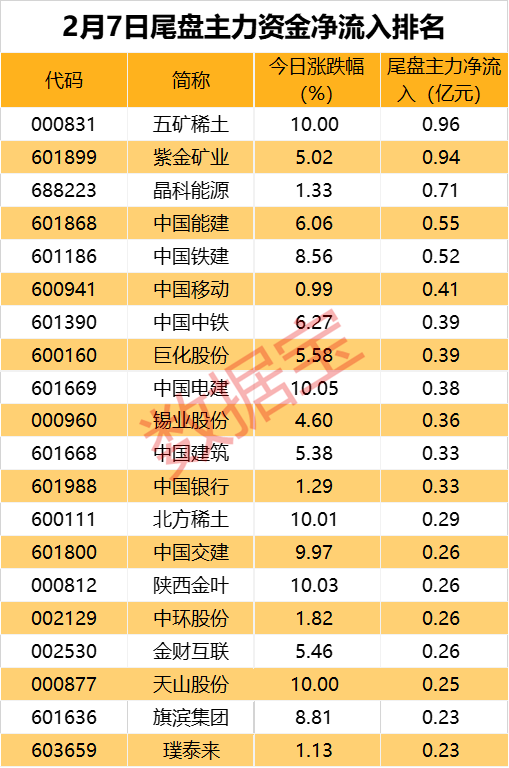 数据宝统计,五矿稀土、紫金矿业、晶科能源、中国能建、中国铁建、中国移动的主力尾盘资金净流入额居前,但均未超过亿元。