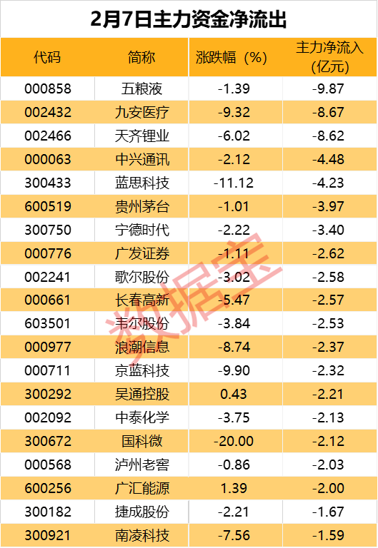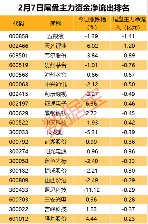 尾盘资金净流出个股中,五粮液和天齐锂业的净流出额均超亿元,除此之外,韦尔股份、贵州茅台、泸州老窖、中兴通讯、海康威视的尾盘资金流出额居前。