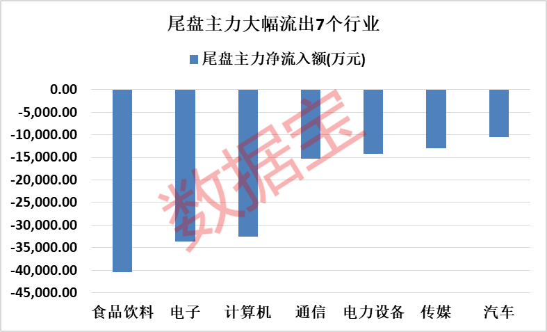 从尾盘资金动向来看,建筑装饰的尾盘净流入额居首,达到2.97亿元,银行、有色金属行业均有超亿元主力资金尾盘流入。7个板块的尾盘资金呈现大幅流出的状态,均超亿元。食品饮料行业净流出4.04亿元,超电子、计算机、通信等。