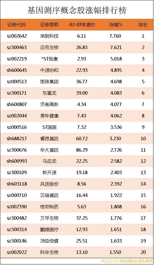 以上就是为读者们带来的基因测序概念股涨幅排行榜的相关信息,本文是根据有关数据及近期事件所撰写分析文章,并不构成投资建议,据此操作,风险自担!(本文属于非商业性文章)