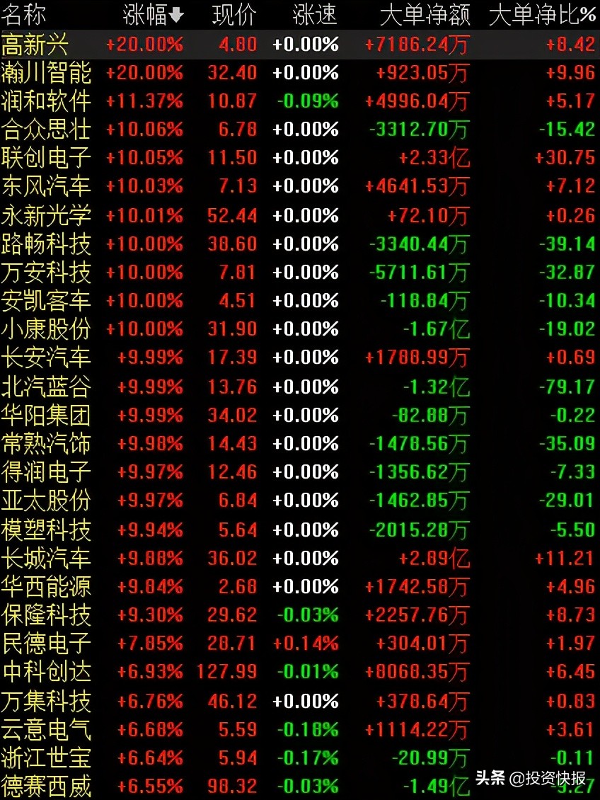 今日,无人驾驶概念爆发,板块指数涨5.72%,板块内瀚川智能、高新兴、合众思壮、联创电子、东风汽车、永新光学、路畅科技、万安科技、小康股份、安凯客车、长安汽车、北汽蓝谷、华阳集团、常熟汽饰、得润电子、亚太股份、模塑科技、华西能源、ST海马等19股涨停。