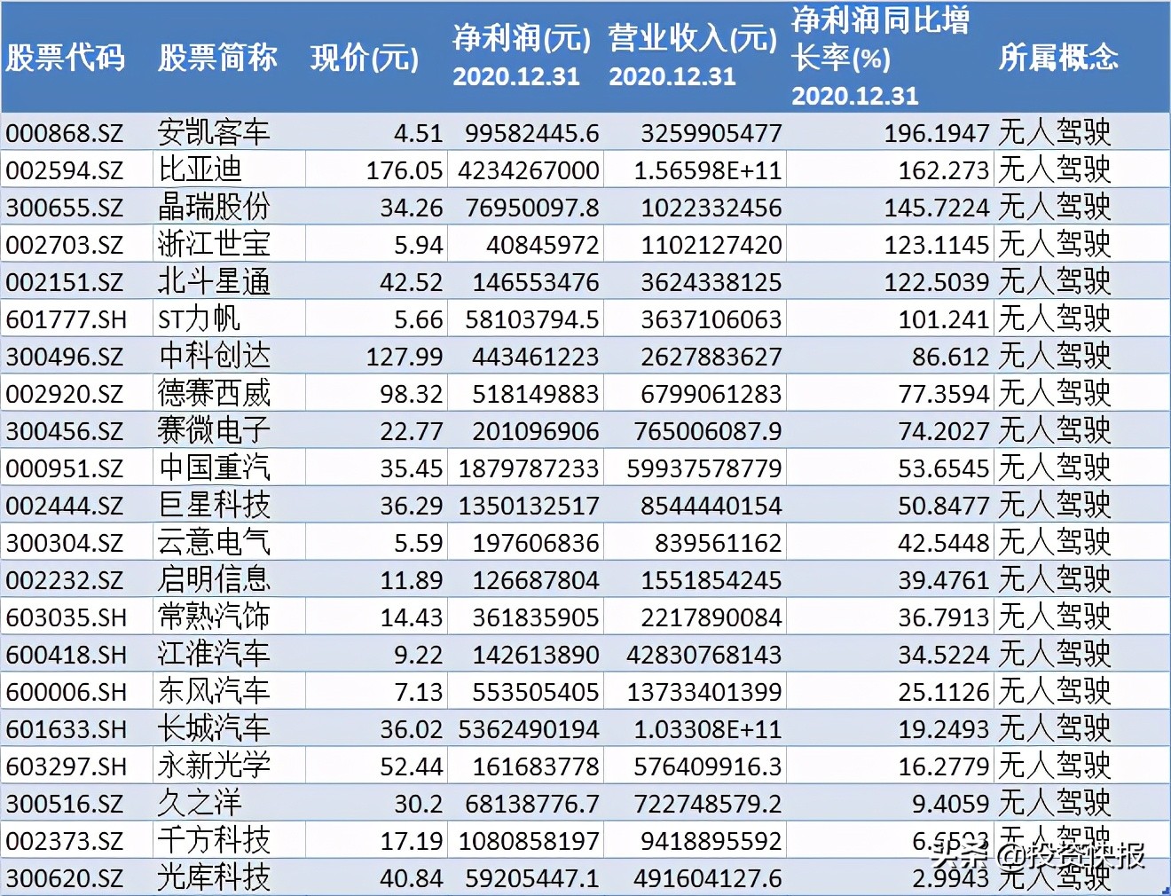 注:去年业绩净利润为正的无人驾驶概念股