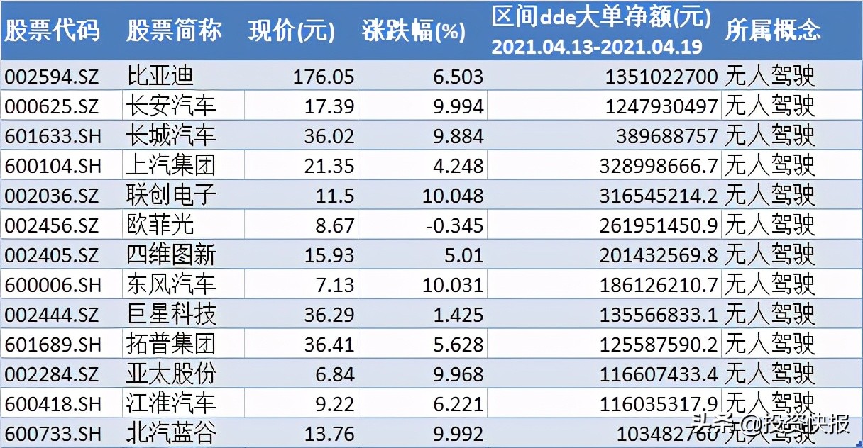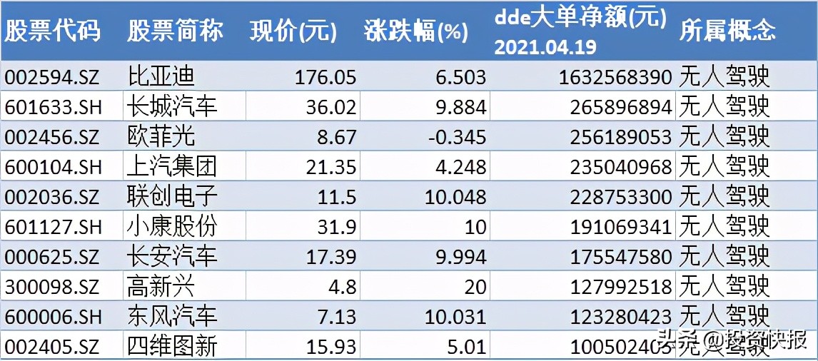 注:4月19日大单资金净额超亿元元的无人驾驶概念股