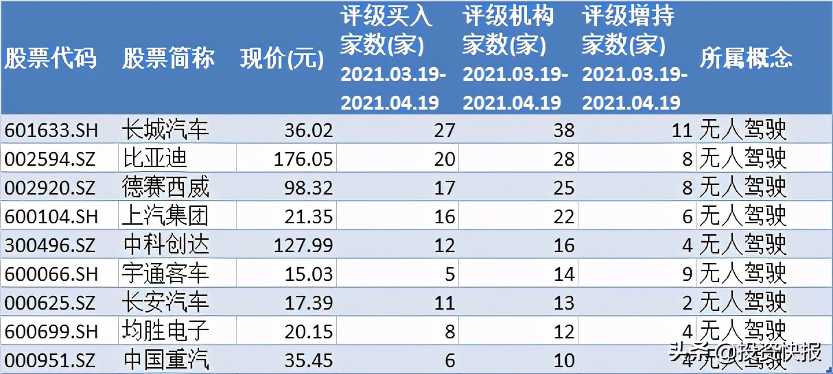 注:获得10家或以上的机构看好的无人驾驶概念股