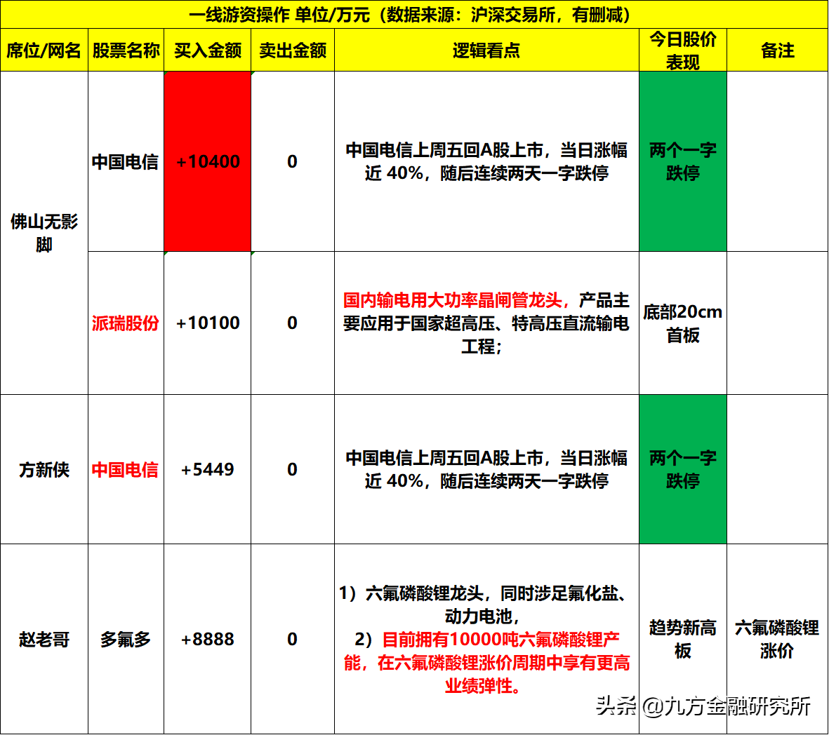 中国电信连续两个一字跌停后,今日两大豪华游资跌停板扫货,佛山无影脚大买1.04亿元;方新侠买5449万元;中国电信有绿鞋机制,如果破发,会触发券商护盘入场。
