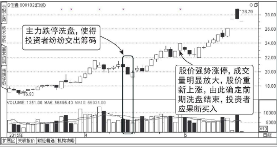 在上涨阶段中主力以跌停的方式洗盘很是凶狠,当这样的走势出现时,投资者以卖出股票为宜。在之后股价重新开始拉升时,且明确知道前期主力跌停洗盘操作已完成之后再进行买入操作。