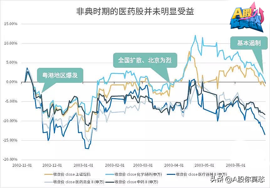 黄色的是上证指数,其余是各个医药板块子行业,不论是化学制药、还是中药为主的预防用药,基本都是跟随行情波动,虽然一度表现出抗跌性,但从整个非典时期来看,医药股还是从哪来回哪去,并没有明显受益。