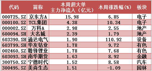 本周两市超大单主力资金净流入前10只个股