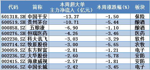 本周两市超大单主力资金净流出前10只个股