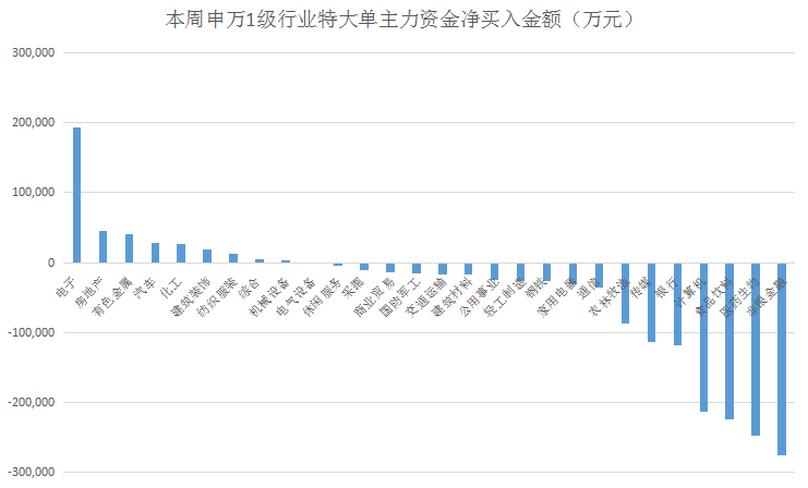 从申万1级28个行业的特大单主力资金流向来看,较上周有所走弱,只有9个行业出现净流入,其中,电子行业优势明显,净流入超19亿元居首。其次是房地产和有色金属行业,均净流入约4亿元。