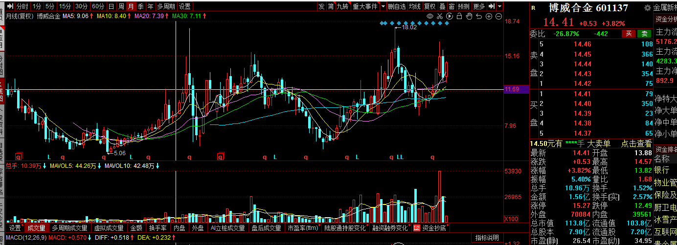 技术形态上看,先看月线,前两个月放出了历史天量,资金介入明显