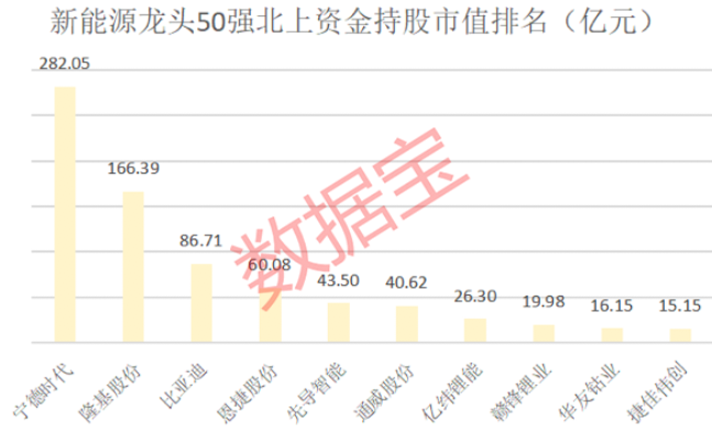 新能源是北上资金重仓板块之一,50强榜单合计持仓接近千亿元。具体到个股方面,宁德时代是其第一重仓,持股市值282.05亿元。此外隆基股份、比亚迪、恩捷股份等个股北上资金持仓市值均超过60亿元,正泰电器、先导智能、通威股份等个股持股市值均超过10亿元。