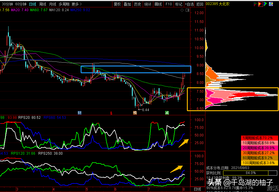 技术面分析:首先从走势上看荃银高科也是震荡上行,走势强劲,该股目前临近前期高位,有一定的压力,这个位置的风报比不是很划算,有较大的不确定性;其次从筹码上看,底部筹码较为牢靠,说明还是有很多资金看好后市的;最后RPS数值目前是3线红,说明走势很强,深受资金青睐。
