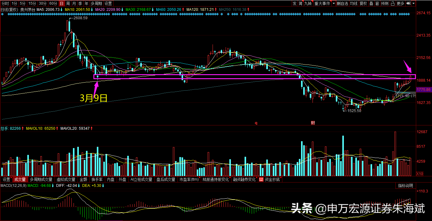 节前茅台的罕见涨停,让人们的视野重回大消费板块,今日茅台重回3月9日平台,即第一波快速下探的低点,亦是中期大平台位置。巧合的是,3月9日——正是资源股启动的日子!