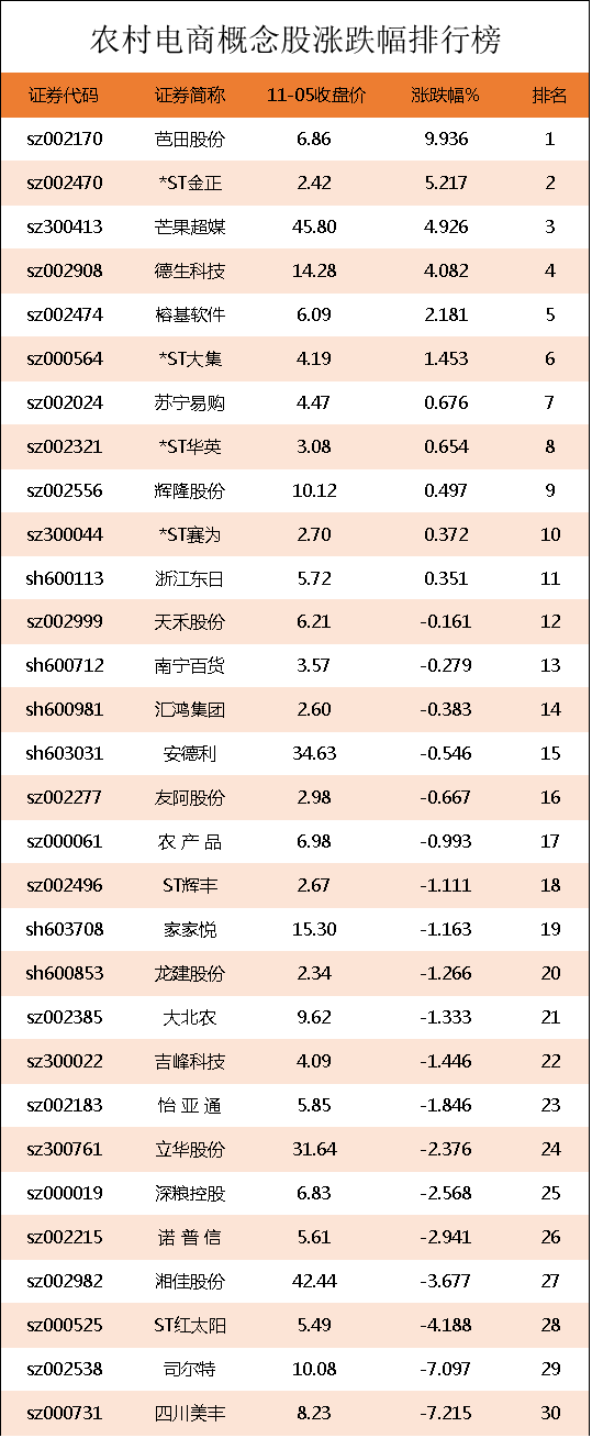 农村电商概念股涨跌幅排行榜