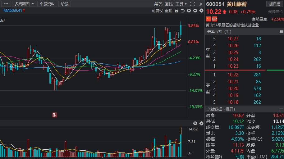 黄山旅游:总市值为62.04亿元,市盈率为282.48倍,机构预测2021年净利润增幅达357.74%