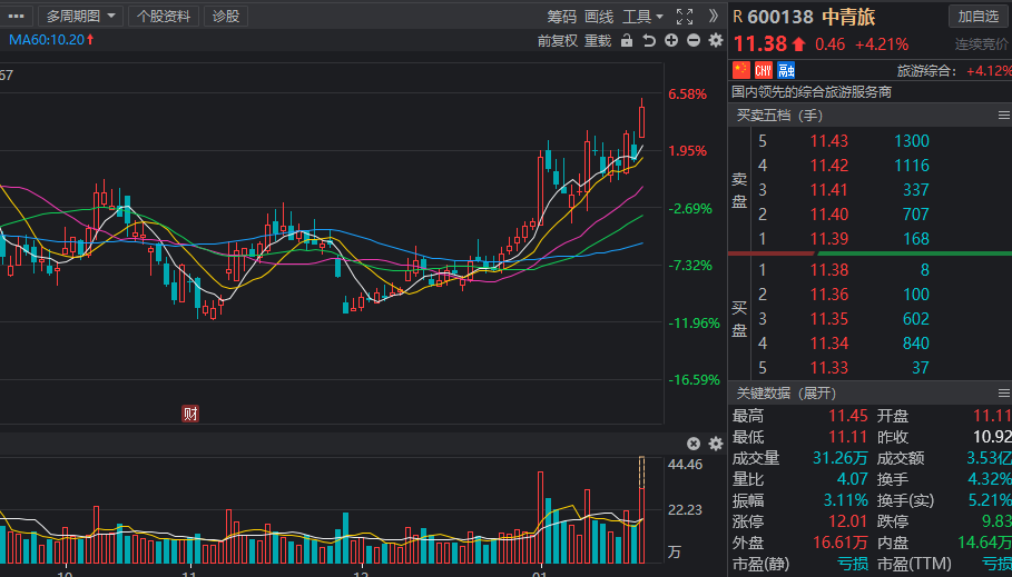 中青旅:总市值为79.04亿元,市盈率为-118.08倍,机构预测2021年净利润增幅达169.60%
