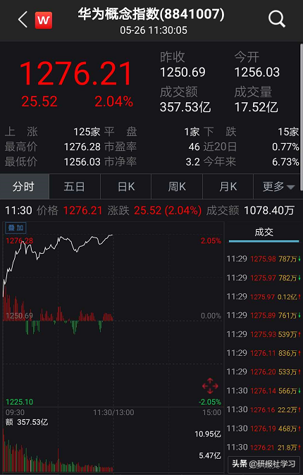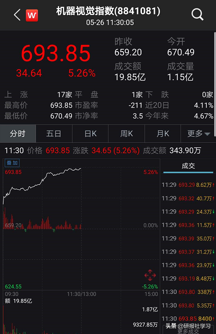 在华为新品发布后,概念股也闻风而动。5月26日上午,华为概念股大涨超2%,市值一度猛飙超900亿,同时机器视觉指数更是大涨超5%,多只概念股涨停,最猛涨幅超20%,成为领涨两市的热门题材。