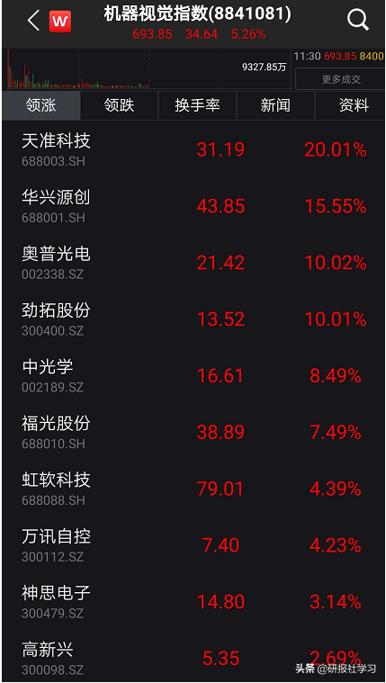 同时,机器视觉指数早盘大涨超5%,板块内天淮科技、华兴源创、奥普光电、劲拓股份强势涨停。其中天淮科技涨超20%。