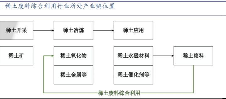 在稀土资源开采总量得到保护性控制,而市场应用需求量却持续稳定增长的市场形势下,发展循环经济、提高资源综合利用率成为满足下游市场需求重要补充。稀土永磁材料生产过程中约产生 25~30%的边角废料,钕铁硼废料成分基本与钕铁硼磁性材料一致,稀土含量约为 31%,