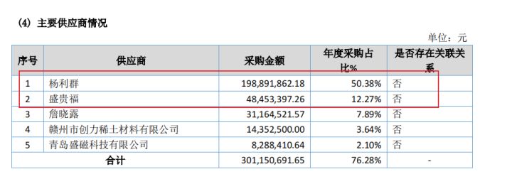 公司原材料的主要供应商均为个人,主要是由于钕铁硼废料主要来源于永磁材料加工企业生产过程中产生的废料,而我国永磁材料加工企业分布范围较广,且单个企业产生的废料量不大,因此钕铁硼废料货源较零星、分散。公司若直接从各个企业采购,需要花费的人力、运输以及谈判的成本较高和耗费较长的时间。而行业内有一批专门从事钕铁硼废料回收的个人,他们具有较全面的货源信息,能够快速的组织货源。因此,公司为了降低采购成本和提高采购效率,通常选择向从事废料收购的个人集中采购。这是钕铁硼废料加工行业的特性。