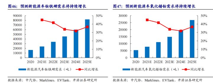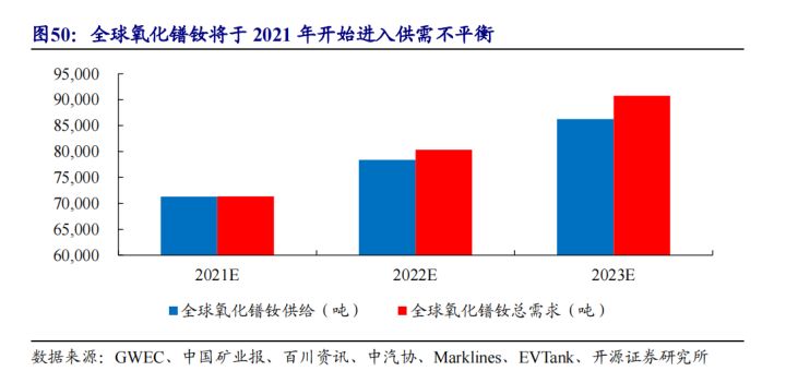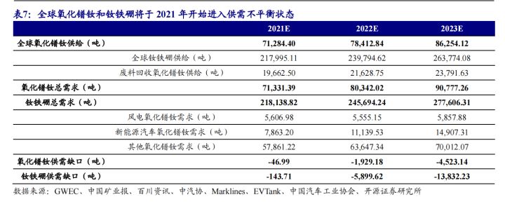 随着新能源汽车、风电等下游需求增长,氧化镨钕或将迎来供需不平衡状态。假设除新能源汽车外其他氧化镨钕需求每年增长 10%。根据测算,全球氧化镨钕将于 2021 年开始进入供需不平衡状态,并且供需缺口将拉大,2025 年将出现约 1.33 万吨的氧化镨钕缺口,换算成钕铁硼为 4.06 吨钕铁硼。